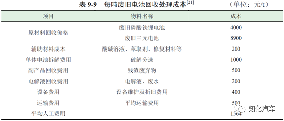陶志軍和賈曉峰通過對北京賽德美動力電池回收產(chǎn)業(yè)的調(diào)研,發(fā)現(xiàn)動力電池回收過程中,成本主要集中在原材料回收、電池拆解預(yù)處理、廢水廢棄物處理、人工費用等階段,表9-9 為每噸廢舊電池回收處理成本。其中,廢舊三元電池平均回收費用為8900 元/t,經(jīng)過梯次利用之后且質(zhì)量較差的磷酸鐵鋰電池平均回收費用為4000 元/t。從調(diào)研數(shù)據(jù)可以看出,回收及拆解每噸三元電池的平均成本為13264 元,回收及拆解每噸磷酸鐵鋰電池的平均成本為8364 元,動力電池內(nèi)富含的大量的有價金屬是電池回收主要的收益來源,特別是近年來鎳、鈷、錳、鋰等金屬材料價格的上漲對動力電池拆解回收領(lǐng)域起到了巨大的促進作用。