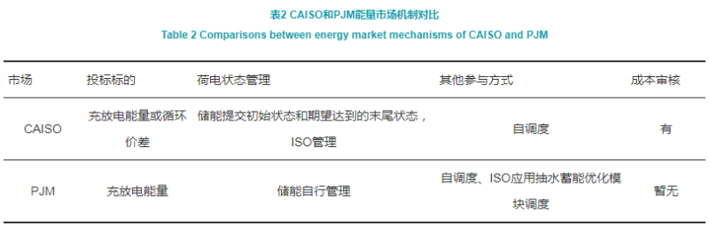 在FERC 841法案下,各ISO在選擇技術(shù)路線方面有一定的自主權(quán),本節(jié)以儲(chǔ)能規(guī)模最大的CAISO、PJM的市場(chǎng)機(jī)制為例進(jìn)行分析,見(jiàn)表2。