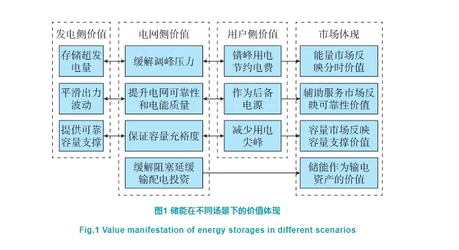 值得注意的是,儲(chǔ)能提供的同一項(xiàng)服務(wù),對(duì)于不同主體有不同的表現(xiàn)形式[20],如圖1所歸納。如削峰填谷,對(duì)電網(wǎng)而言表現(xiàn)為緩解調(diào)峰壓力[21],對(duì)新能源而言表現(xiàn)為存儲(chǔ)超發(fā)電量[22],對(duì)用戶而言表現(xiàn)為錯(cuò)峰用電[23]。由于本文的落腳點(diǎn)在于市場(chǎng)機(jī)制,從市場(chǎng)的角度來(lái)看,以上3個(gè)價(jià)值均可以通過(guò)能量市場(chǎng)分時(shí)的價(jià)格信號(hào)加以體現(xiàn),由市場(chǎng)采購(gòu)并統(tǒng)一提供。當(dāng)然,這些服務(wù)也可由發(fā)電側(cè)、用電側(cè)主體與儲(chǔ)能簽訂使用協(xié)議而自行購(gòu)買。具體選擇哪種模式,是儲(chǔ)能市場(chǎng)設(shè)計(jì)中待探討的問(wèn)題。