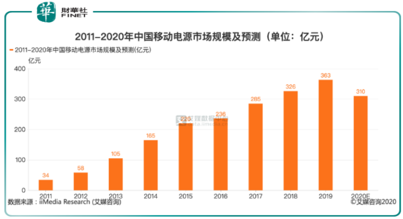 國(guó)內(nèi)移動(dòng)電源市場(chǎng)方興未艾。據(jù)艾媒數(shù)據(jù)顯示,國(guó)內(nèi)移動(dòng)電源市場(chǎng)規(guī)模持續(xù)擴(kuò)大,從2011年的34億元到2019年的363億元。但2020年智能手機(jī)出貨量增速下降,市場(chǎng)對(duì)移動(dòng)電源需求略有下滑。