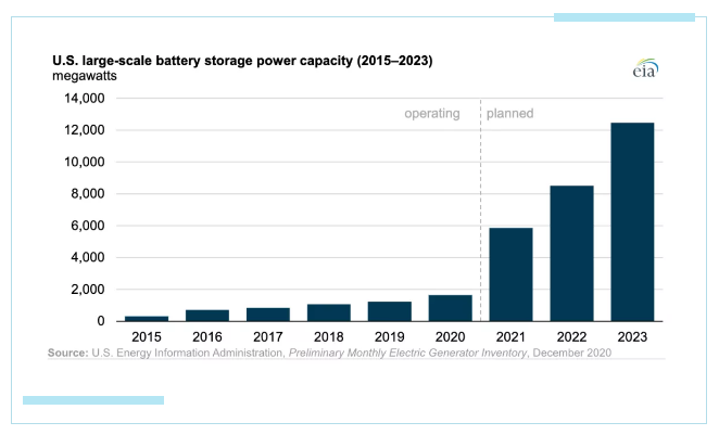 根據(jù)美國能源信息署的數(shù)據(jù),2020年美國的大規(guī)模電池存儲容量繼續(xù)保持顯著增長趨勢,美國電池容量在2020年增長了35%,達(dá)到1650兆瓦。在過去5年中美國電池儲能容量已經(jīng)增長了三倍,這一趨勢預(yù)計將繼續(xù)下去,在2021年至2023年期間美國可新增10000兆瓦以上的大型電池儲能,是2019年容量的10倍。