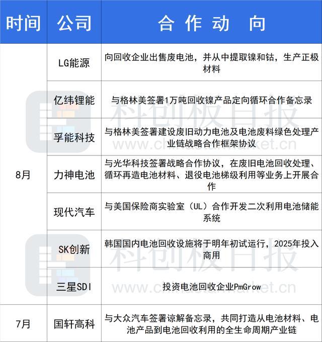 本次五部門聯(lián)合引發(fā)的《管理辦法》中提及,鼓勵梯次利用企業(yè)與汽車主機廠、電池廠等產(chǎn)業(yè)鏈企業(yè)協(xié)議合作。事實上,從行業(yè)近兩個月動態(tài)來看,選擇攜手共贏的廠商愈來愈多。中金公司報告也指出,廠商在電池回收利用方面的戰(zhàn)略合作,有望進一步強化產(chǎn)業(yè)鏈縱向深度整合。