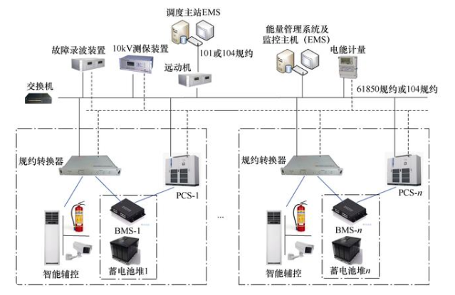 儲能電站按無人值班原則設計,采用兩層網(wǎng)絡結(jié)構(gòu)的計算機監(jiān)控系統(tǒng)。站控層設備配置滿足儲能電站監(jiān)控系統(tǒng)功能要求,配置監(jiān)控主機(EMS主機)、數(shù)據(jù)通信網(wǎng)關機(遠動機)、綜合應用服務器等;間隔層設備由保護測控裝置、BMS、PCS、故障錄波裝置等組成,完成本間隔設備的就地監(jiān)視、信息遠傳等功能。儲能電站集中式監(jiān)控方案示意圖如圖2所示,它實現(xiàn)了一套EMS監(jiān)控全站BMS和PCS。