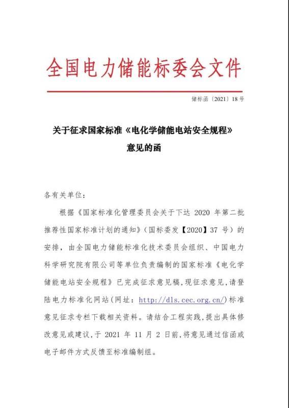 關(guān)于征求國家標(biāo)準(zhǔn)《電化學(xué)儲能電站安全規(guī)程》意見的函