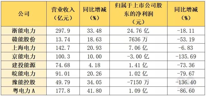 2021年上半年地方發(fā)電企業(yè)上市公司業(yè)績指標
