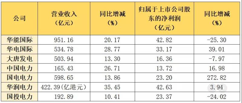2021年上半年主要發(fā)電央企上市公司業(yè)績指標