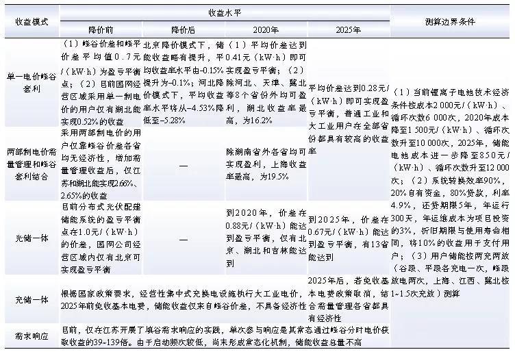 (3)對(duì)于客戶側(cè)儲(chǔ)能,需量管理和峰谷價(jià)差共同回收模式下,儲(chǔ)能盈利性水平主要與峰谷價(jià)差、儲(chǔ)能投資建設(shè)成本、循環(huán)次數(shù)、充放電模式、用戶分成比例以及對(duì)需量降低的效率影響等指標(biāo)有關(guān)。通過建立儲(chǔ)能成本分析模式進(jìn)行經(jīng)濟(jì)性測(cè)算,當(dāng)前,普通工業(yè)和大工業(yè)用戶安裝儲(chǔ)能僅少部分省份能實(shí)現(xiàn)盈虧平衡,隨著儲(chǔ)能技術(shù)經(jīng)濟(jì)性提升,按工業(yè)電價(jià)降價(jià)前目錄電價(jià)計(jì)算,2020年已具有較好的盈利性。按照2019年工業(yè)電價(jià)水平下降要求,在北京市降價(jià)模式下(峰、平、谷價(jià)格統(tǒng)一下降同一額度,峰谷價(jià)差和峰平價(jià)差保持不變),儲(chǔ)能收益略有提升,在多數(shù)省份采用的河北省降價(jià)模式下(下降比例基本相同,峰谷價(jià)差和峰平價(jià)差縮?。瑑?chǔ)能收益將明顯下降。