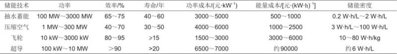 儲能技術(shù)可以分為物理儲能和化學(xué)儲能兩類,各類儲能技術(shù)所應(yīng)用的場景不同,所要求的技術(shù)條件也有所不同。但不同儲能技術(shù)種類的技術(shù)水平和發(fā)展方向均面向市場化應(yīng)用,因此其應(yīng)滿足三個基本要求:安全性高、全生命周期的性價比高、全生命周期的環(huán)境負(fù)荷低。表3和表4列出了主要的物理儲能和化學(xué)儲能技術(shù)的關(guān)鍵參數(shù)。