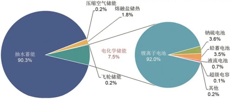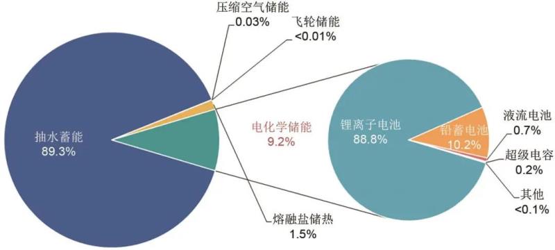 根據(jù)中關(guān)村儲能產(chǎn)業(yè)技術(shù)聯(lián)盟的統(tǒng)計,截止到2020年底,全球儲能裝機已經(jīng)達(dá)到191 GW,其中抽水蓄能裝機占儲能總裝機的90.3%,電化學(xué)儲能裝機占比為7.5%,熔融鹽儲熱裝機占比為1.8%,壓縮空氣儲能和飛輪儲能占比均為0.2%。2020年新增儲能裝機6.4 GW,雖然有疫情影響仍逆勢增長,其中電化學(xué)儲能突破10 GW(圖8)。截止到2020年底,我國已投運儲能項目累計35.6 GW,新增裝機3.2 GW,同比增長9.8%。我國抽水蓄能裝機占儲能總裝機的89.3%,電化學(xué)儲能裝機占比為9.2%,熔融鹽儲熱裝機占比為1.5%,壓縮空氣儲能裝機占比為0.03%(圖9)。