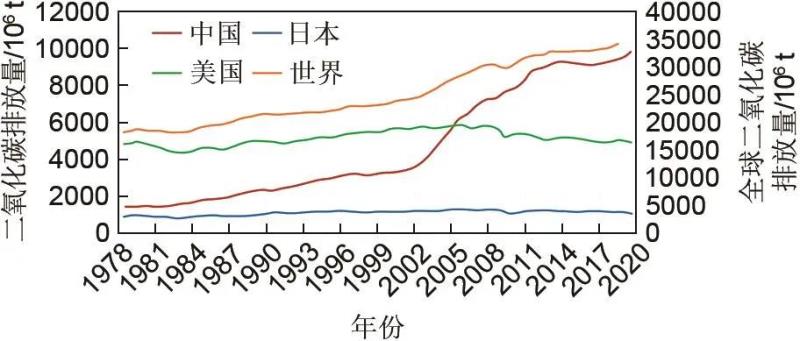 目前已有120個國家制定了碳中和的目標(biāo)與路線圖,主要國家和地區(qū)的碳中和目標(biāo)與主要措施詳見表1。碳中和已經(jīng)成為大國競爭的重點領(lǐng)域,將深刻影響全球的環(huán)境治理。中國實施“碳達(dá)峰、碳中和”路徑的主要特點和挑戰(zhàn)包括兩方面。①時間短。世界主要國家碳達(dá)峰到碳中和的過渡期如圖1所示,我國實現(xiàn)“碳達(dá)峰、碳中和”僅有30年的時間,時間非常緊迫;②任務(wù)重。中國、美國、日本和世界CO2排放量如圖2所示,可以看出我國年CO2排放量已居世界第一,且我國是發(fā)展中國家,處于全面高速發(fā)展的階段,CO2排放量處于逐步增長的階段。