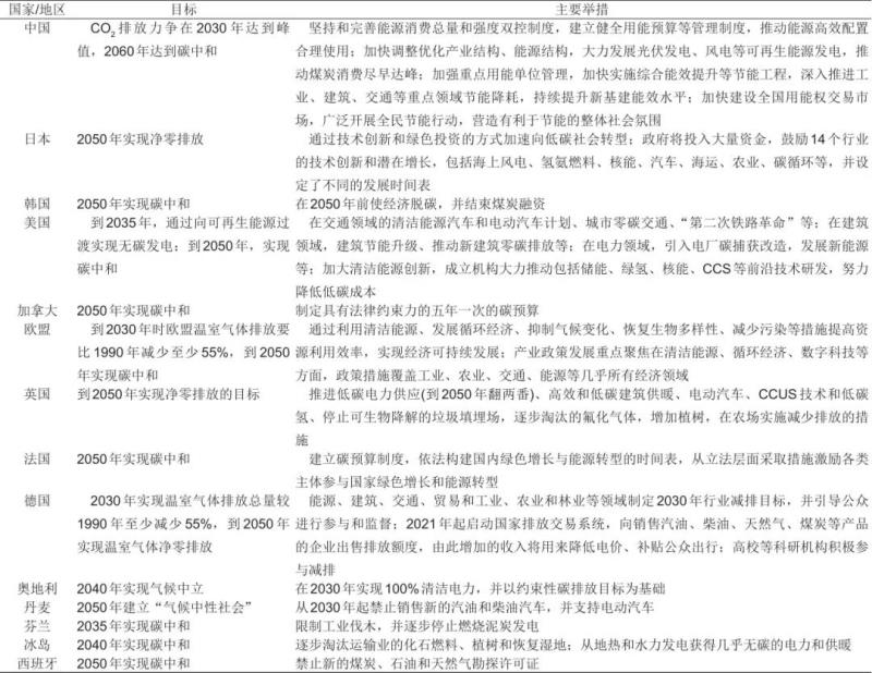 表1 世界主要國家和地區(qū)的碳中和目標(biāo)與主要舉措