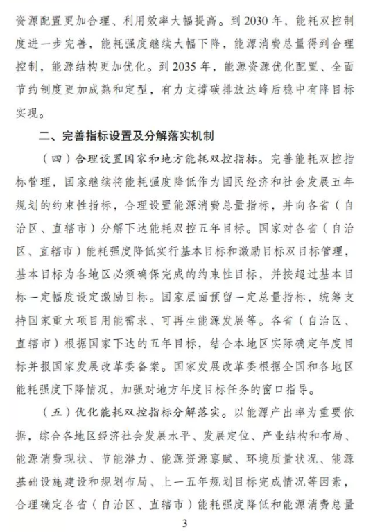 《方案》提出,到2025年,能耗雙控制度更加健全,能源資源配置更加合理、利用效率大幅提高。到2030年,能耗雙控制度進(jìn)一步完善,能耗強(qiáng)度繼續(xù)大幅下降,能源消費(fèi)總量得到合理控制,能源結(jié)構(gòu)更加優(yōu)化。到2035年,能源資源優(yōu)化配置、全面節(jié)約制度更加成熟和定型,有力支撐碳排放達(dá)峰后穩(wěn)中有降目標(biāo)實(shí)現(xiàn)。