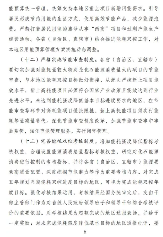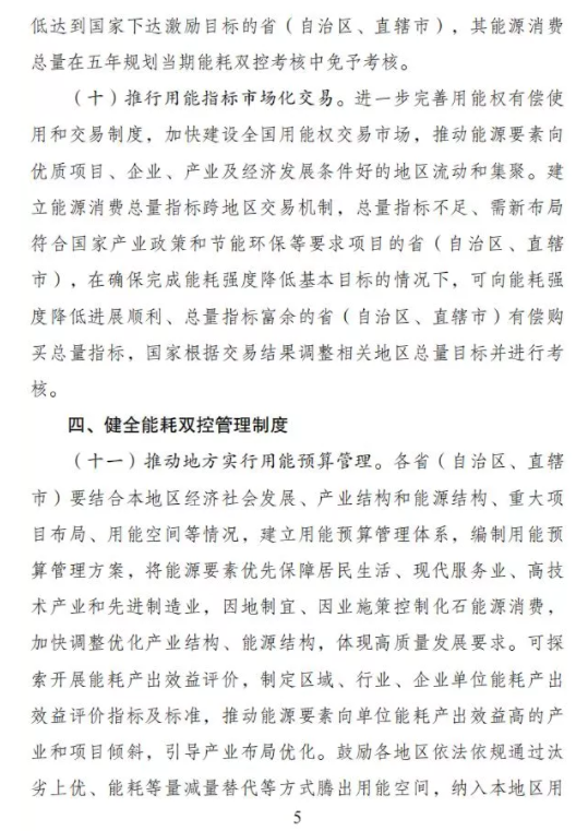 《方案》還提出,合理設(shè)置國(guó)家和地方能耗雙控指標(biāo)。完善能耗雙控指標(biāo)管理,國(guó)家繼續(xù)將能耗強(qiáng)度降低作為國(guó)民經(jīng)濟(jì)和社會(huì)發(fā)展五年規(guī)劃的約束性指標(biāo),合理設(shè)置能源消費(fèi)總量指標(biāo),并向各省(自治區(qū)、直轄市)分解下達(dá)能耗雙控五年目標(biāo)。國(guó)家對(duì)各?。ㄗ灾螀^(qū)、直轄市)能耗強(qiáng)度降低實(shí)行基本目標(biāo)和激勵(lì)目標(biāo)雙目標(biāo)管理,基本目標(biāo)為各地區(qū)必須確保完成的約束性目標(biāo),并按超過基本目標(biāo)一定幅度設(shè)定激勵(lì)目標(biāo)。國(guó)家層面預(yù)留一定總量指標(biāo),統(tǒng)籌支持國(guó)家重大項(xiàng)目用能需求、可再生能源發(fā)展等。各?。ㄗ灾螀^(qū)、直轄市)根據(jù)國(guó)家下達(dá)的五年目標(biāo),結(jié)合本地區(qū)實(shí)際確定年度目標(biāo)并報(bào)國(guó)家發(fā)展改革委備案。國(guó)家發(fā)展改革委根據(jù)全國(guó)和各地區(qū)能耗強(qiáng)度下降情況,加強(qiáng)對(duì)地方年度目標(biāo)任務(wù)的窗口指導(dǎo)。