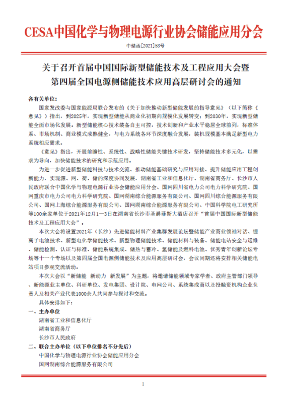 為進(jìn)一步促進(jìn)新型儲(chǔ)能科技與技術(shù)交流、推動(dòng)儲(chǔ)能基礎(chǔ)研究與應(yīng)用對(duì)接、提升儲(chǔ)能應(yīng)用工程創(chuàng)新能力,實(shí)現(xiàn)源、網(wǎng)、荷、儲(chǔ)的深度協(xié)同發(fā)展,湖南省工業(yè)和信息化廳、湖南省商務(wù)廳、長(zhǎng)沙市人民政府聯(lián)合中國(guó)化學(xué)與物理電源行業(yè)協(xié)會(huì)儲(chǔ)能應(yīng)用分會(huì)、國(guó)網(wǎng)四川省電力公司電力科學(xué)研究院、國(guó)網(wǎng)重慶市電力公司電力科學(xué)研究院、國(guó)網(wǎng)湖南綜合能源服務(wù)有限公司、國(guó)網(wǎng)四川綜合能源服務(wù)有限公司、國(guó)網(wǎng)上海綜合能源服務(wù)有限公司、國(guó)網(wǎng)湖南綜合能源服務(wù)有限公司、中國(guó)科學(xué)院電工研究所等100余家單位于2021年12月1—3日在湖南省長(zhǎng)沙市圣爵菲斯大酒店召開(kāi)“首屆中國(guó)國(guó)際新型儲(chǔ)能技術(shù)及工程應(yīng)用大會(huì)”。