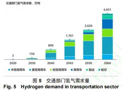 提高能源效率是緩解能源需求總量攀升的重要路徑,但是在目前使用內(nèi)燃機和石油的情況下,能源效率提高并不能實現(xiàn)交通領域零排放。交通運輸部門要實現(xiàn)碳中和,將需要道路交通全面電氣化,同時航空和船運逐步替換使用零碳燃料等。在碳中和情景下,預計到 2060 年交通部門氫消費量約 4000 萬噸,如圖5 所示。