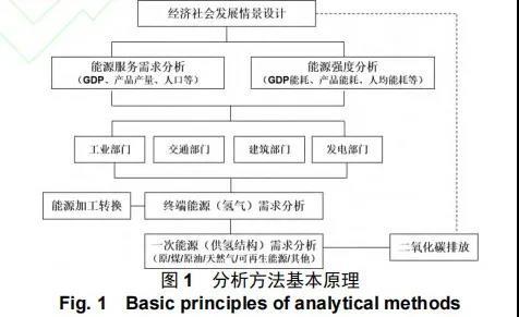 本研究選用情景分析模型,具體采用基于長期能源替代規(guī)劃系統(tǒng) LEAP 模型(Long-range Energy Alternatives Planning System)的自下而上分析方法,利用現(xiàn)有統(tǒng)計和預測數(shù)據(jù),對人口、城鎮(zhèn)化進程、以及工商業(yè)、建筑、交通和農(nóng)業(yè)等各部門中不同技術轉(zhuǎn)換、能源產(chǎn)品生產(chǎn)以及終端用能特性進行分析,推演并預估能源消費終端中消耗的能源類型、消費方式、能源效率以及年活動水平等參數(shù)的變化趨勢,同時根據(jù)發(fā)展需求設置不同情景,依此分析預測 2060 年前的氫能的消費總量及結(jié)構(gòu)。