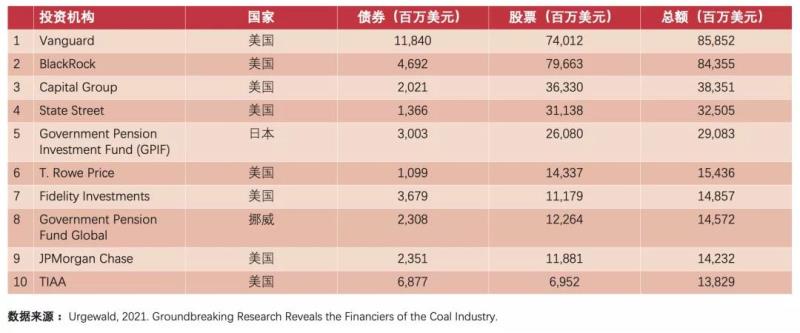 截至2021年1月,美國(guó)投資者在全球煤炭行業(yè)持有的股票和債券總價(jià)值6020億美元,合計(jì)占全球煤炭行業(yè)機(jī)構(gòu)投資的58%,其中以共同基金公司先鋒領(lǐng)航集團(tuán)(Vanguard)的860億美元和資產(chǎn)管理公司貝萊德集團(tuán)(BlackRock)的840億美元為首,日本和英國(guó)的投資者在全球煤炭行業(yè)的機(jī)構(gòu)投資中所占份額分別位居第二和第三位(見(jiàn)下表)。