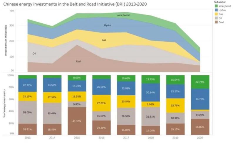 2013-2020中國(guó)在一帶一路國(guó)家能源投資的種類(lèi)分布,圖標(biāo)自上而下為:風(fēng)能/光能,水能,天然氣,石油,煤炭。來(lái)源:CUFE