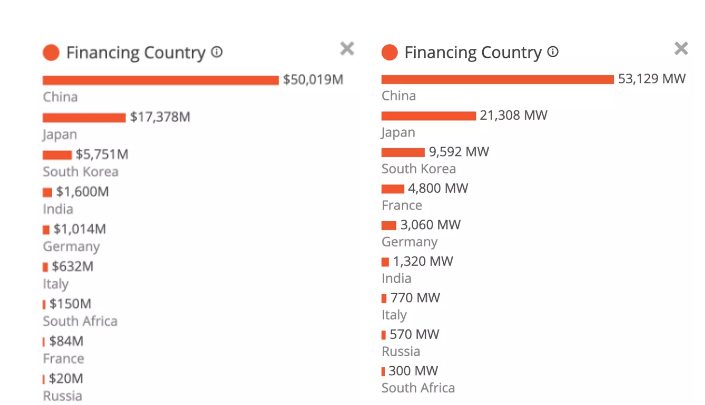 國(guó)際煤電項(xiàng)目主要公共資金來(lái)源國(guó)及支持規(guī)模和容量,單位:百萬(wàn)美元、兆瓦,數(shù)據(jù)來(lái)源:GCPFT