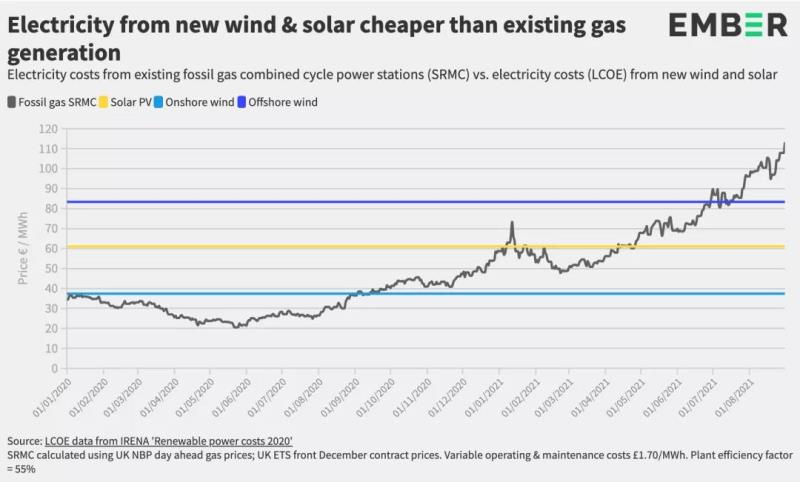 避免天然氣波動(dòng)的唯一辦法是加速向清潔電力的過(guò)渡,因?yàn)轱L(fēng)能和太陽(yáng)能不會(huì)受到燃料成本市場(chǎng)波動(dòng)的影響。根據(jù)國(guó)際可再生能源署最新發(fā)布的數(shù)據(jù),英國(guó)現(xiàn)有天然氣發(fā)電廠的發(fā)電成本是新建陸上風(fēng)電發(fā)電成本的三倍,幾乎是新建太陽(yáng)能發(fā)電成本的兩倍。即使是新建海上風(fēng)電的平準(zhǔn)成本(LCOE)目前也比天然氣氣發(fā)電便宜。即便不考慮碳價(jià),天然氣發(fā)電成本仍然比風(fēng)能和太陽(yáng)能更昂貴。