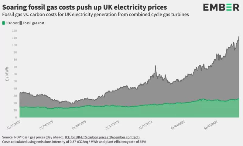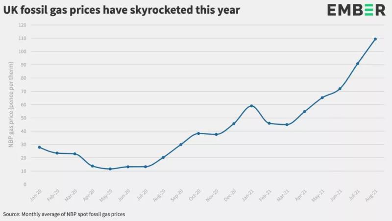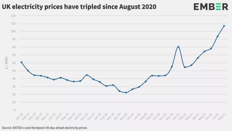 咨詢機(jī)構(gòu)Ember的最新分析顯示,英國(guó)的電價(jià)在過(guò)去一年上漲了兩倍。電價(jià)飛漲是多種因素共同作用的結(jié)果:北半球寒冷的冬季耗盡了天然氣儲(chǔ)存;亞洲需求和價(jià)格的增加導(dǎo)致液化天然氣運(yùn)往亞洲而不是歐洲;隨著新冠病毒限制的解除,全球經(jīng)濟(jì)反彈市場(chǎng)天然氣需求增加;從俄羅斯經(jīng)由烏克蘭進(jìn)口的天然氣尚未啟動(dòng),不能滿足歐洲需求的增長(zhǎng)。