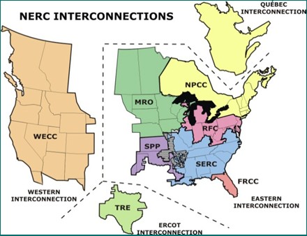 北美互聯(lián)電網(wǎng)是美洲最大的互聯(lián)電網(wǎng),服務(wù)人口4.4億、裝機(jī)規(guī)模12.7億千瓦。由東部電網(wǎng)、西部電網(wǎng)、德州電網(wǎng)和加拿大的魁北克電網(wǎng)四個(gè)同步電網(wǎng)組成。
