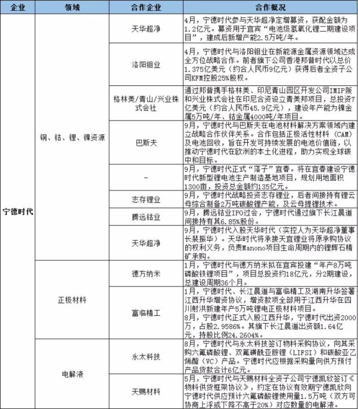 據(jù)不完全統(tǒng)計,寧德時代直接或間接參股的上游材料企業(yè)超過20家,通過控股、兼并購、深度綁定以加深對鋰電池上游原材料的掌控。
