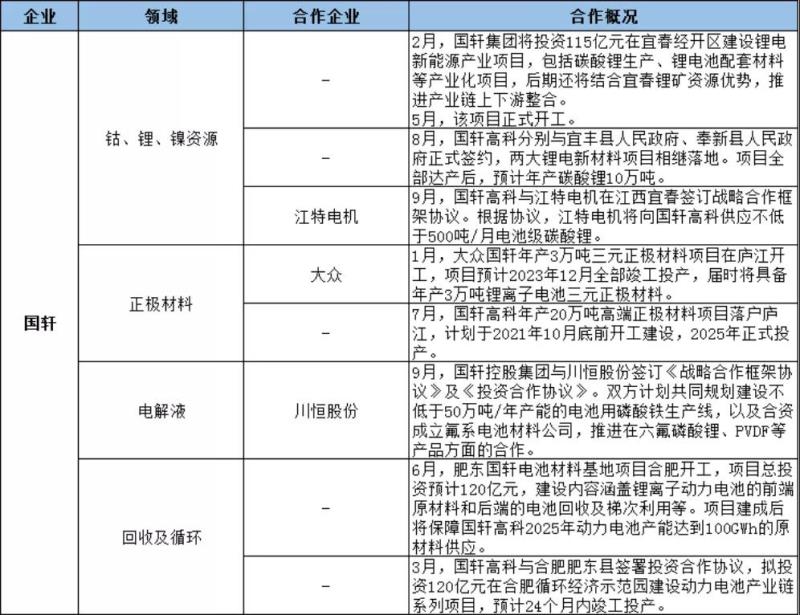 來看2021年以來,寧德時代、國軒高科、億緯鋰能等頭部動力電池企業(yè)的上游資源的加速布局: