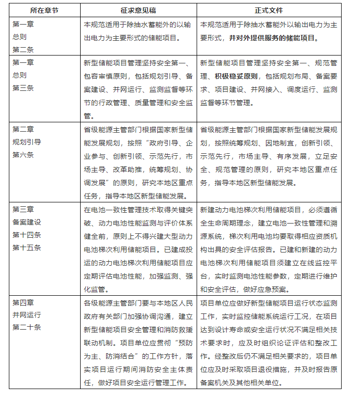 《新型儲能項目管理規(guī)范》征求意見稿與正式文件對比:
