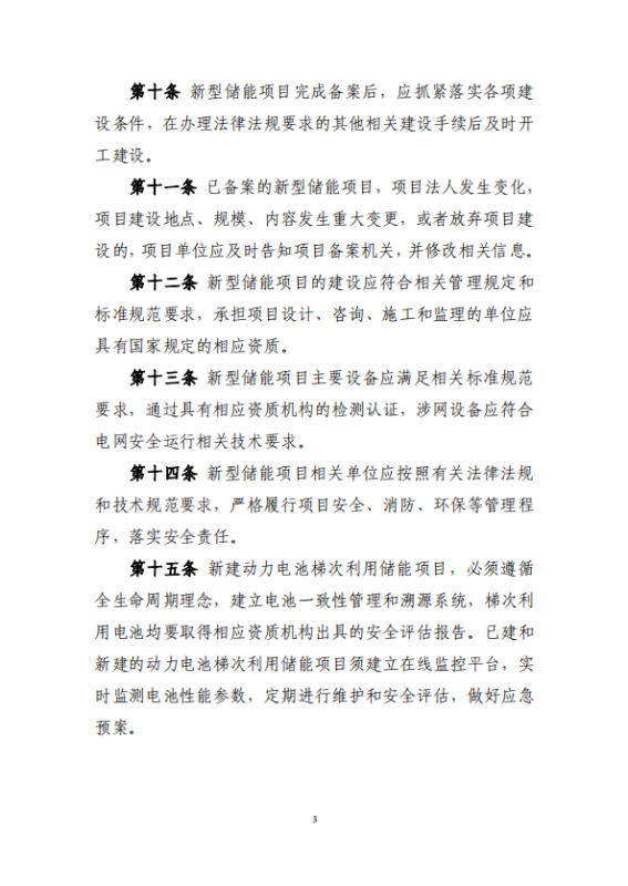 第三條 新型儲能項目管理堅持安全第一、規(guī)范管理、積極穩(wěn)妥原則,包括規(guī)劃布局、備案要求、項目建設、并網(wǎng)接入、調(diào)度運行、監(jiān)測監(jiān)督等環(huán)節(jié)管理。