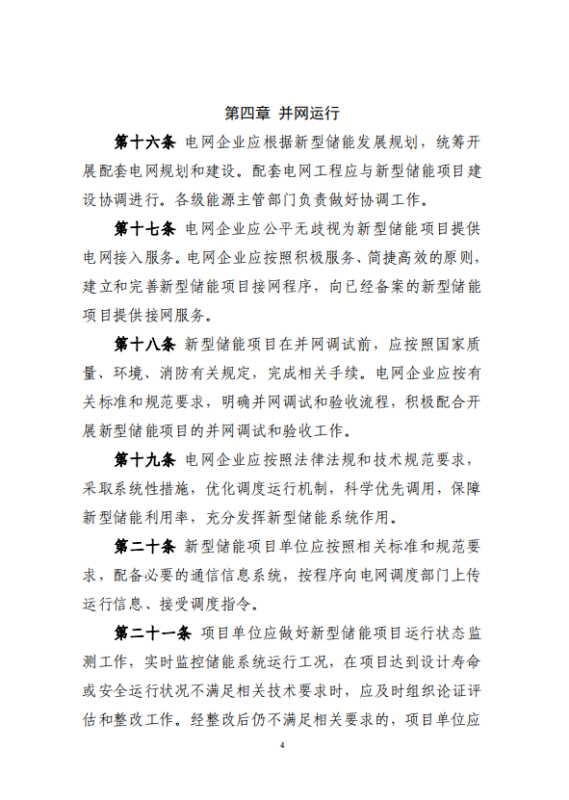 第十八條 新型儲能項目在并網(wǎng)調(diào)試前,應按照國家質(zhì)量、環(huán)境、消防有關規(guī)定,完成相關手續(xù)。電網(wǎng)企業(yè)應按有關標準和規(guī)范要求,明確并網(wǎng)調(diào)試和驗收流程,積極配合開展新型儲能項目的并網(wǎng)調(diào)試和驗收工作。