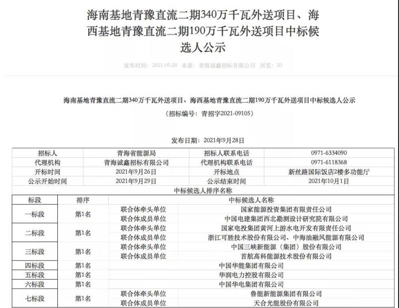 9月28日,海南基地青豫直流二期340萬千瓦外送項目、海西基地青豫直流二期190萬千瓦外送項目進(jìn)行了中標(biāo)候選人公示。其中,光伏項目規(guī)模3.5GW,風(fēng)電項目規(guī)模1.5GW,光熱規(guī)模300MW。
