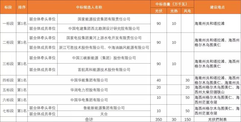 本次招標(biāo)共劃分7個標(biāo)段,國家能源投資集團(tuán)有限責(zé)任公司(牽頭)、中國電建集團(tuán)西北勘測設(shè)計研究院有限公司中標(biāo)第一標(biāo)段;國家電投集團(tuán)黃河上游水電開發(fā)有限責(zé)任公司(牽頭)、浙江可勝技術(shù)股份有限公司、中海油融風(fēng)能源有限公司中標(biāo)第二標(biāo)段;中國三峽新能源(集團(tuán))股份有限公司(牽頭)、首航高科能源技術(shù)股份有限公司中標(biāo)第三標(biāo)段;中國華能集團(tuán)有限公司、華潤電力控股有限公司、中國華電集團(tuán)有限公司分別中標(biāo)四、五、六標(biāo)段;魯能新能源集團(tuán)有限公司(牽頭)、天合光能股份有限公司中標(biāo)第七標(biāo)段。具體中標(biāo)結(jié)果見下: