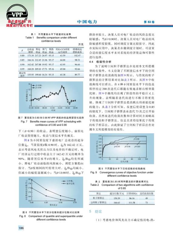 結(jié)論:(1)考慮電價和風(fēng)光出力不確定性的電-熱-氣虛擬電廠隨機(jī)優(yōu)化模型所得收益的期望值高于確定性模型,從而降低了確定性模型的調(diào)度保守性,使得虛擬電廠有更多的機(jī)會獲得更高的經(jīng)濟(jì)效益,更適于其市場行為。(2)電-熱-氣虛擬電廠的收益與置信水平之間存在的負(fù)相關(guān)關(guān)系,更切實(shí)地反映了投資領(lǐng)域中的低風(fēng)險低收益、高風(fēng)險高收益的特點(diǎn),電廠決策者可根據(jù)自身風(fēng)險偏好來權(quán)衡風(fēng)險與收益之間的關(guān)系。(3)將虛擬電廠從僅參與電力市場擴(kuò)展到同時參與電力市場和天然氣市場,有利于獲得更好的經(jīng)濟(jì)效益和調(diào)度運(yùn)行的靈活性。若進(jìn)一步考慮未來氣價和熱價的隨機(jī)性,則可更加反映多種市場的特點(diǎn)。虛擬電廠參與氣電市場的研究方法可擴(kuò)展至其參與多種市場如電、氣、熱市場、旋轉(zhuǎn)備用市場等的研究。