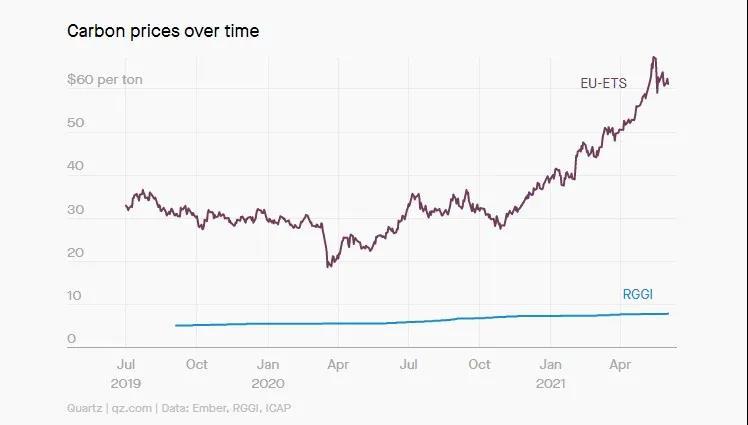 除了電力供給突然的變化、天然氣原料價(jià)格上漲。歐洲碳價(jià)的飛漲也是本輪刺激歐洲電價(jià)的主要原因之一。過去十年左右的時(shí)間里,歐洲碳價(jià)基本在50歐元以內(nèi)。但是今年碳價(jià)一路上揚(yáng),甚至突破了60歐元。