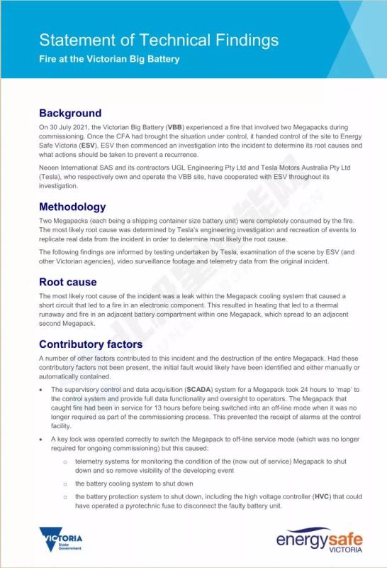 中國(guó)儲(chǔ)能網(wǎng)訊:9月28日,澳大利亞維多利州亞州能源安全部門正式發(fā)布了儲(chǔ)能火災(zāi)事故調(diào)查結(jié)果,報(bào)告顯示冷卻系統(tǒng)內(nèi)泄漏造成短路、繼而引發(fā)了儲(chǔ)能火災(zāi)。而監(jiān)控系統(tǒng)沒(méi)有按要求24小時(shí)運(yùn)行也是該事故的另內(nèi)在原因。