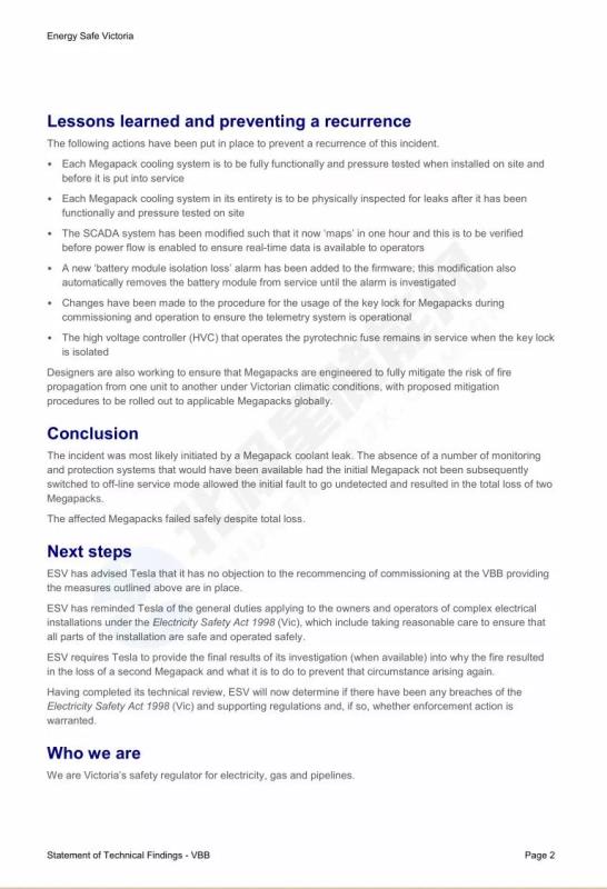 Neoen International SAS 及其承包商 UGL Engineering Pty Ltd 和 Tesla Motors Australia Pty Ltd (Tesla) 分別擁有和運(yùn)營(yíng) VBB 站點(diǎn),并在整個(gè)調(diào)查過(guò)程中與 ESV 合作。
