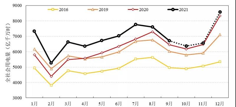 圖2 2021年全社會(huì)月度用電量預(yù)測(cè)及與近年比較