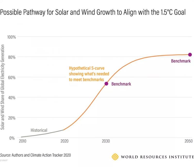 為了與1.5攝氏度的路徑保持一致,可再生能源需要在2030年達到全球電力的55%至95%,在2050年達到98%至100%,讓太陽能和風能占主導地位,其他可再生能源則起到補充作用。