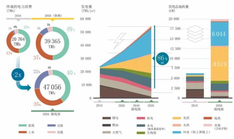 注:IRENA的路線圖情景包括了低碳技術(shù)的應(yīng)用,主要是可再生能源和能效提升,來(lái)實(shí)現(xiàn)全球能源系統(tǒng)的轉(zhuǎn)型以達(dá)到全球溫升2℃的控制目標(biāo)。該評(píng)估考慮了可再生能源的潛能的所有潛能,與各國(guó)專家共同開展了各國(guó)的分析,然后,將這些結(jié)果整合起來(lái)獲得全球的結(jié)果。