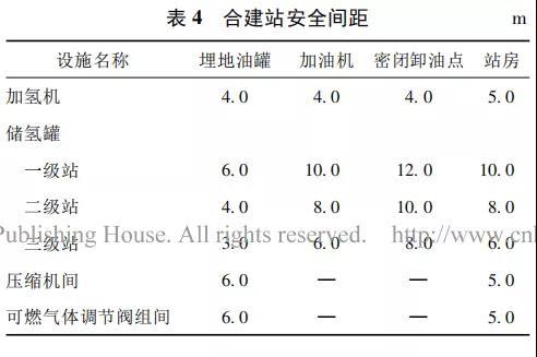 為確保加氫站的安全穩(wěn)定運(yùn)行,不論是在加氫站選址、設(shè)備布局、工藝及工程設(shè)計(jì)階段,還是設(shè)備選型、施工、驗(yàn)收、運(yùn)營(yíng)過(guò)程,都必須嚴(yán)格按照相關(guān)標(biāo)準(zhǔn)和規(guī)范開展工作。如: 指導(dǎo)加氫站設(shè)計(jì)的《加氫站技術(shù)規(guī)范》GB 50516—2010、《加氫站安全技術(shù)規(guī)范》GB /T 34584—2017 等。GB 50516—2010 對(duì)站址選擇、總平面布置、安全間距、加氫工藝與設(shè)施、消防與安全設(shè)施、建筑設(shè)施、給排水、電氣裝置、施工安裝驗(yàn)收及運(yùn)營(yíng)管理等方面做了明確的規(guī)定。合建站內(nèi)加氫機(jī)、儲(chǔ)氫罐、壓縮機(jī)間、可燃?xì)怏w調(diào)節(jié)閥組間與加油站內(nèi)埋地油罐、加油機(jī)、密閉卸油點(diǎn)、站房的間距見表 4。國(guó)外加氫站工藝設(shè)備布置緊湊,與國(guó)外同類型加氫站安全間距相比,我國(guó)規(guī)范的安全間距仍有縮減的空間,從而利于用地布局。