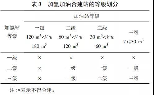 油氫合建站的等級(jí)劃分參見表 3。從表中可以看出,一級(jí)加油站內(nèi)不得合建加氫站,二級(jí)加油站內(nèi)與二級(jí)加氫站、三級(jí)加氫站合建后上升為一級(jí)油氫合建站,兩種等級(jí)的三級(jí)加油站與二級(jí)加氫站合建后均升級(jí)為一級(jí)油氫合建站,三級(jí)加油站( 30 m3≤ V≤60 m3 ) 與三級(jí)加氫站合建時(shí),升級(jí)為二級(jí)油氫合建站,三級(jí)加油站( V≤30 m3 ) 與三級(jí)加氫站合建時(shí),仍為三級(jí)油氫合建站。