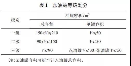 現(xiàn)行國(guó)家標(biāo)準(zhǔn)《汽車加油加氣站設(shè)計(jì)與施工規(guī)范》GB 50156—2012( 2014 年版) 中第 3. 0. 9 條( 見 表 1) 規(guī)定了加油站等級(jí)。