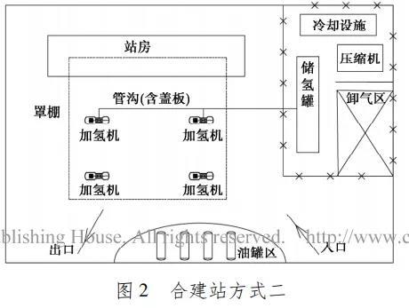 兩種常見的合建站平面布置方案分別如圖 1、 圖 2 所示。針對(duì)既有加油站內(nèi)增設(shè)氫氣加注功能,可以采用固定儲(chǔ)氫設(shè)施和移動(dòng)儲(chǔ)氫設(shè)施兩種模式。
