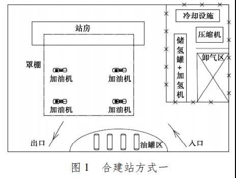油氫合建站總圖布置需要考慮兩方面因素,一個(gè)是合建站內(nèi)設(shè)施之間,以及站內(nèi)與站外建構(gòu)筑物的安全間距; 一個(gè)是功能劃分,滿足合建站內(nèi)加油、加氫車輛的合理車行流向。