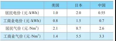 表1美國、日本和中國典型電價氣價
