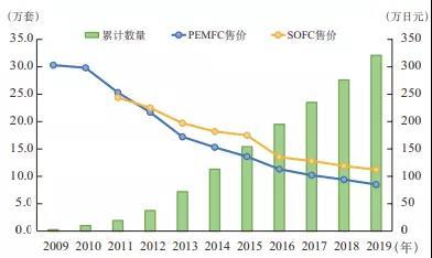 如(圖1)所示,產(chǎn)品最初價格為303萬日元,日本政府每套補(bǔ)貼140萬日元或者制造成本的一半。隨著銷售量增加和技術(shù)升級,制造成本逐漸降低,補(bǔ)貼力度也隨之階梯式減少。截至2019年,已有約32萬戶日本家庭購買了Ene-Farm系統(tǒng),主機(jī)價格平均降到不到100萬日元。10年售價累計降幅約70%,政府補(bǔ)貼也已經(jīng)下降到不超過八萬日元水平(SOFC)。日本政府原計劃到2020年累計部署140萬臺家用燃料電池?zé)犭娐?lián)產(chǎn)系統(tǒng),并全面取消補(bǔ)貼。從實際情況看,這一目標(biāo)基本無法實現(xiàn)。