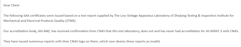 10月1日,澳洲SAA Approvals Pty Ltd發(fā)布重磅消息,正式通知所有通過ZTME實(shí)驗(yàn)室獲得的AS60947.3報告無效,這也意味著幾乎所有SAA頒發(fā)的隔離開關(guān)證書失效。而從2022年1月1日開始,澳洲市場銷售的外置隔離開關(guān)必須要有新認(rèn)證,而目前僅有通過TüV萊茵澳大利亞本土獲得AS60947.3報告的隔離開關(guān)才符合澳洲市場要求!