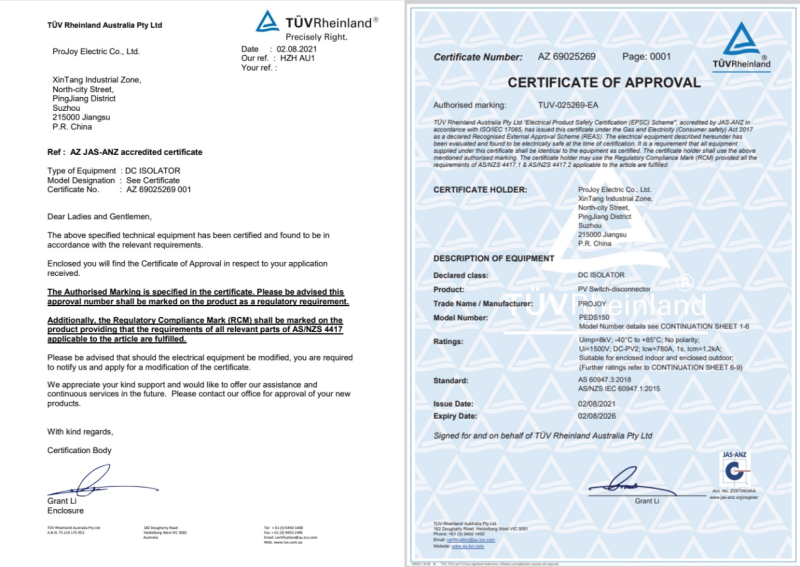 早在8月初,蘇州普兆新能源設(shè)備有限公司(簡稱“普兆”)PEDS16-55A( 300V~1500V)全部系列直流隔離開關(guān)通過澳大利亞AS 60947.3:2018和 AS/NZS IEC 60947.1:2015標(biāo)準(zhǔn)測試,率先獲得TüV萊茵澳大利亞本土認(rèn)證,這是國內(nèi)首家獲得澳洲本土認(rèn)證的隔離開關(guān)品牌!