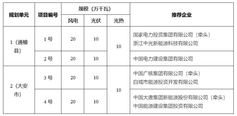 9月23日,白城市政府公示了競(jìng)爭(zhēng)性優(yōu)選結(jié)果。四個(gè)標(biāo)段分別由:國(guó)家電投、中電建、中廣核、大唐獲得,具體如下表所示。